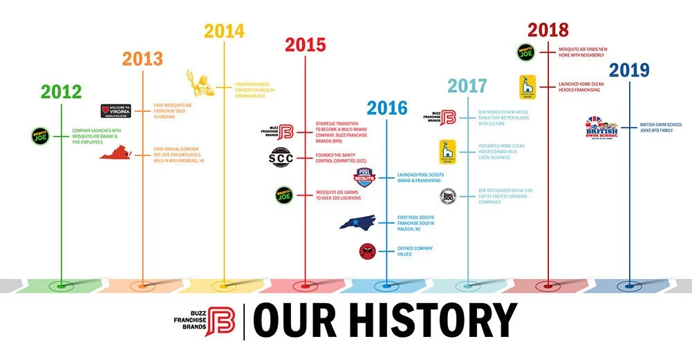 When Buzz Franchise Brands first started in 2012, our team developed the founding brand, Mosquito Joe, into a 280-location franchise across 34 states plus the District of Columbia. Three short years later, a second brand was added to the family with Pool Scouts, and then a third, Home Clean Heroes, in 2017. While Mosquito Joe found a new home in 2018, we continued to own and operate our pool cleaning and home cleaning companies until 2019, when we welcomed our newest brand to the family, British Swim School. See the full timeline of our story here.